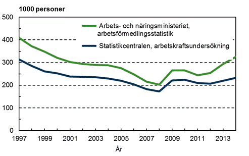 Statistikcentralens arbetslöshetssiffror baserar sig på arbetskraftsundersökningen som är urvalsbaserad. Arbets- och näringsministeriets siffror åter baserar sig på arbetsförmedlingsstatistik som framställts på basis av arbets- och näringsbyråernas kundregister. Statistikcentralens och arbets- och näringsministeriets siffror har alltid avvikit från varandra. Under åren 2006–2011 var antalet arbetslösa enligt arbetskraftsundersökningen 31 000–44 000 färre på årsnivå än enligt arbetsförmedlingsstatistiken. Fr.o.m. år 2012 har skillnaden mellan antalet arbetslösa ökat och var 94 000 år 2014 (figuren). Den främsta orsaken till skillnaden är att Statistikcentralen och Arbets- och näringsministeriet definierar en arbetslös olika Skillnaden har också ökat i och med att det inte längre beviljas arbetslöshetspensioner och att det skett ändringar i lagstiftningen som inverkar på arbetsförmedlingsstatistikens definition av en arbetslös.