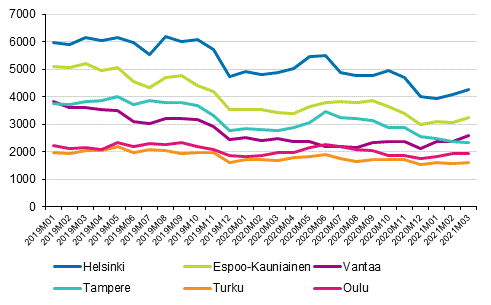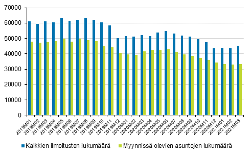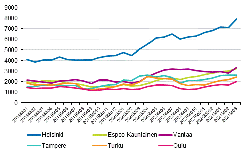 Vuokra-asuntoja oli tarjolla verkkopalvelussa maaliskuussa 34 598, mikä on 32 prosenttia enemmän kuin edellisvuonna vastaavaan aikaan. Vuoden 2021 ensimmäisellä neljänneksellä vuokrailmoitusten määrät ovat kasvaneet muissa suurissa kaupungeissa paitsi Tampereella, jossa määrät ovat pysyneet samoina tammi-maaliskuun ajan.