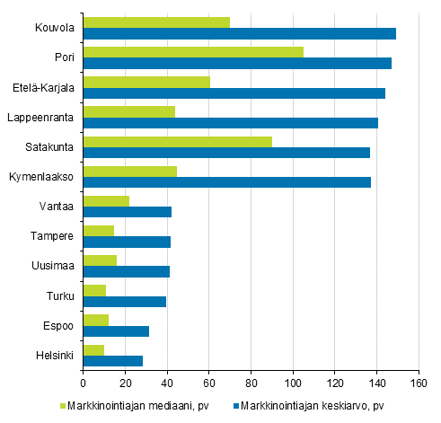 Suurimmista kaupungeista ja maakuntakeskuksista markkinointiajat olivat maaliskuussa pisimmät Kouvolassa ja Porissa. Markkinointiajat on laskettu tilastokuukauden aikana poistuneista asuntoilmoituksista.