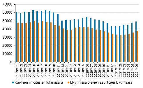 Vanhojen kerros- ja rivitaloasuntojen myynti-ilmoituksia oli verkkopalvelussa kesäkuussa 5 prosenttia ja omakotitalojen myynti-ilmoituksia 20 prosenttia vähemmän kuin vuosi sitten. Uusien kerros- ja rivitaloasuntojen myynti-ilmoituksia oli 12 prosenttia vähemmän kuin vuosi sitten.