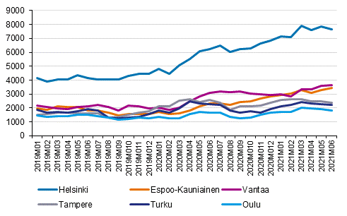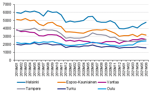 Vuokra-asuntoja oli tarjolla verkkopalvelussa kesäkuussa 33 899, mikä on 9 prosenttia enemmän kuin viime vuonna vastaavaan aikaan. Vuoden 2021 toisella neljänneksellä vuokrailmoitusten määrät ovat kasvaneet muissa suurissa kaupungeissa paitsi Tampereella ja Turussa verrattuna vuoden takaiseen.