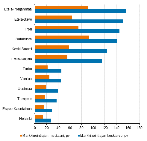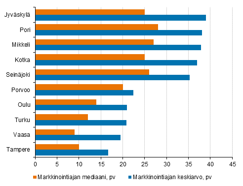Kokeellisen tilaston mukaan vanhan kerros- ja rivitaloasunnon keskimääräinen markkinointiaika oli kesäkuussa noin 28 päivää Helsingissä ja Espoossa. Tampereella markkinointiaika oli 37 päivää, Turussa ja Vantaalla keskimäärin noin 45 päivää ja Oulussa 62 päivää. Suurista kaupungeista vanhojen asuntojen markkinointiajat lyhenivät viime vuodesta eniten Espoossa, 44 prosenttia. Helsingissä markkinointiajat lyhenivät 30 prosenttia ja Tampereella 26 prosenttia.