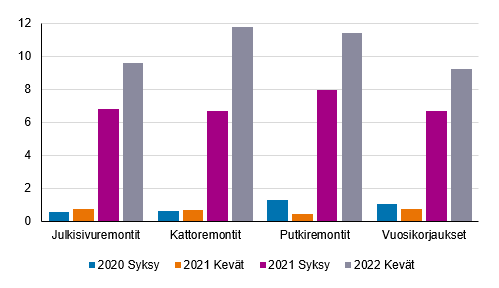 Isännöitsijöiltä, vuokrataloyhtiöiltä ja julkisyhteisöiltä on kysytty arviota hinnanmuutoksesta korjausrakentamisessa yleisesti ja remonttityypeittäin putki-, julkisivu- ja kattoremonteista sekä vuosikorjauksista. Remonttityypeistä hinnat nousivat eniten kattoremonteissa, joiden hinnat kasvoivat 11,8 prosenttia. Putkiremonttien hinnat nousivat 11,4 prosenttia, julkisivuremonttien hinnat nousivat 9,6 prosenttia ja vuosikorjausten hinnat 9,3 prosenttia.