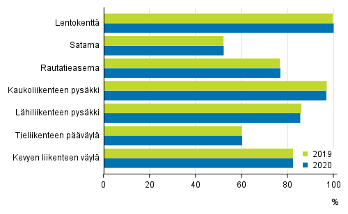 Liikenneverkon peittävyys pysyi vuoden 2019 tasolla vuonna 2020. Suurimmat muutokset tapahtuivat lentokenttien ja rautatieasemien peittävyydessä maakunnittain tarkastellen. Satamien, kevyen liikenteen väylien ja kauko- ja lähiliikenteen pysäkkien peittävyys pysyi koko valtakunnan ja myös maakuntien tasolla pääosin ennallaan.