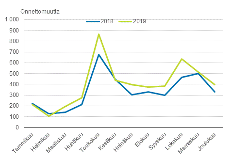 Kaikkiaan vuonna 2019 kirjattiin 13 433 tieliikenteen riistaonnettomuutta. Syksyn kuukausien lisäksi onnettomuuksia tapahtui paljon touko-kesäkuussa. Vuoden 2019 toukokuussa sattui 1 450 onnettomuutta. Kaikkein vähiten onnettomuuksia kirjattiin helmi-maaliskuussa. Maaliskuussakin tieliikenteessä tapahtui kuitenkin lähes 400 riistaonnettomuutta.