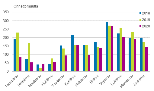 Kuvio 1. Riistaonnettomuudet kuukausittain vuosina 2018-2020