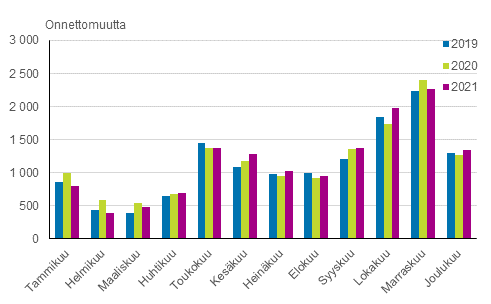 Kuvio 1. Riistaonnettomuudet kuukausittain vuosina 2019-2021