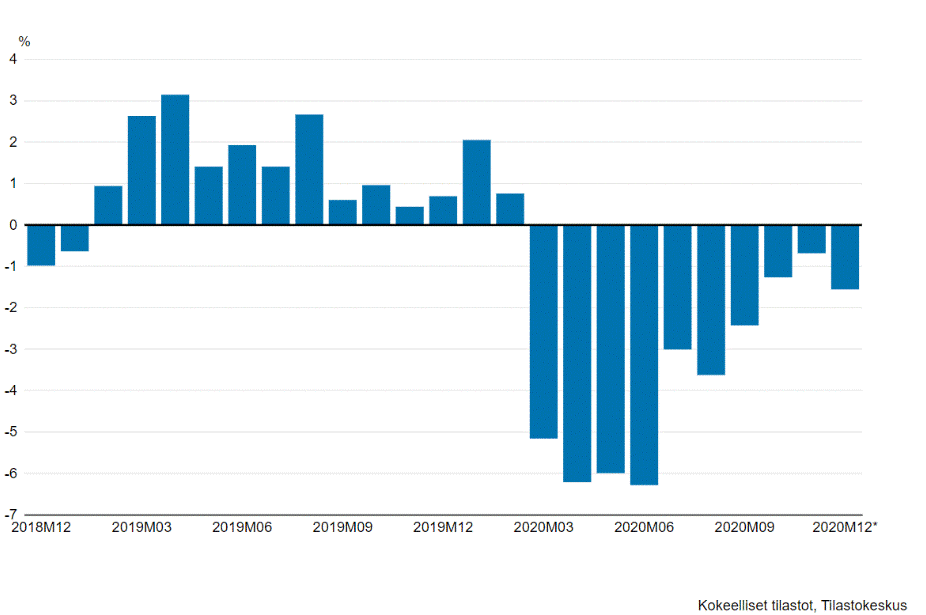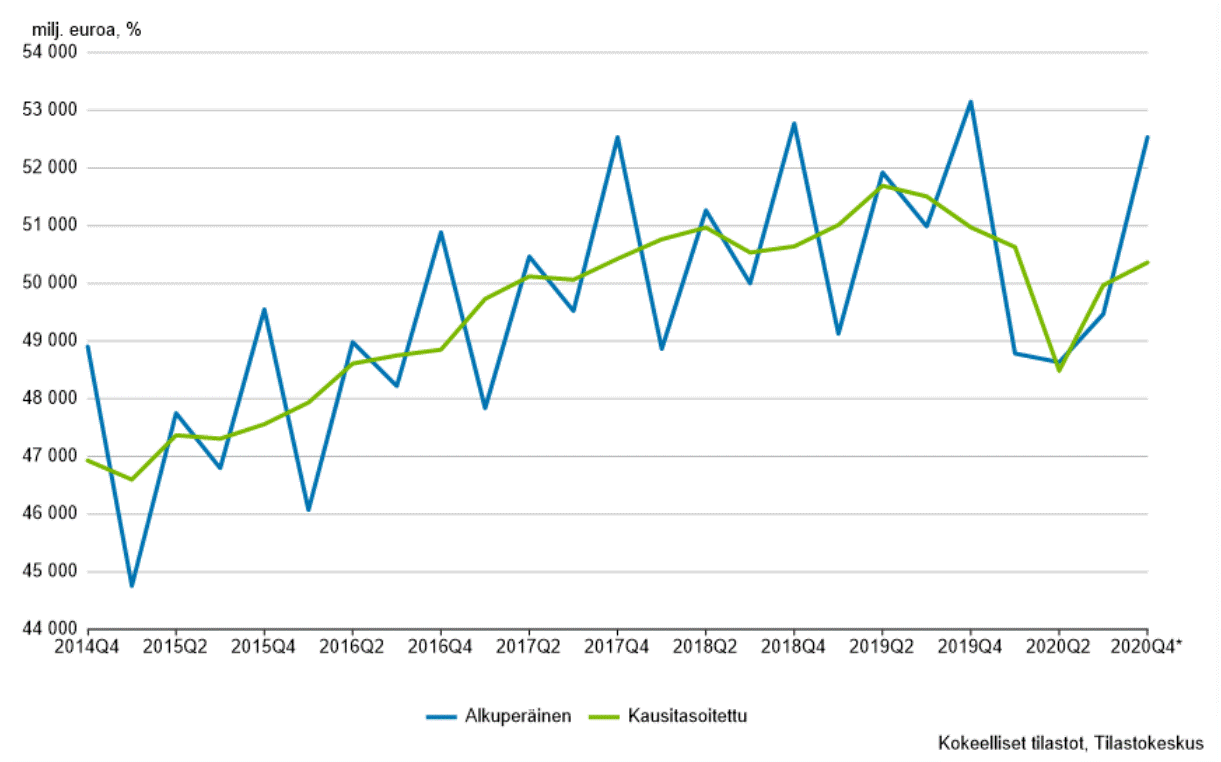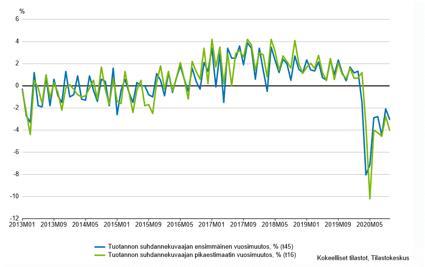 Tilastokeskuksen kokeellisen tilaston mukaan vuoden 2020 viimeisen neljänneksen kausitasoitettu tuotanto kasvoi 0,8 prosenttia edellisestä neljänneksestä. Viimeisen neljänneksen kalenterikorjattu vuosimuutos oli -1,2 prosenttia. Neljännesvuositason tiedot perustuvat tuotannon suhdannekuvaajan joulukuun estimaattiin, jonka mukaan kausitasoitettu tuotanto laski joulukuussa 0,7 prosenttia marraskuuhun verrattuna.
