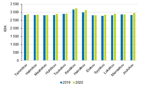 Kuvio 1. Palkka- ja palkkiotulojen mediaani kuukausittain 2019 ja 2020