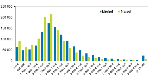 Vaikka naisten ja miesten yleisin tuloluokka syyskuussa 2020 oli sama 2 500–2 999 euroa kuukaudessa, oli palkka- ja palkkiotulojen tasossa eroa naisten ja miesten välillä. Naisia oli enemmän kaikissa alimmissa tuloluokissa luokkaan 2 500–2 999 euroa kuukaudessa saakka. Miehiä oli taas enemmän kaikissa ylemmissä tuloluokissa tuloluokasta 3 000–3 499 euroa kuukaudessa lähtien. Eroa selittää osaltaan mies- ja naisvaltaisten alojen erot, mutta tässä tilastossa myös osa-aikainen työskentely, jota naiset tekevät yleisemmin kuin miehet. Tilastokeskuksen kokeellinen tilasto Tulorekisterin palkat ja palkkiot kattaa kaikki maksetut palkka- ja palkkiotulot työsuhteen koko- tai osa-aikaisuudesta riippumatta.