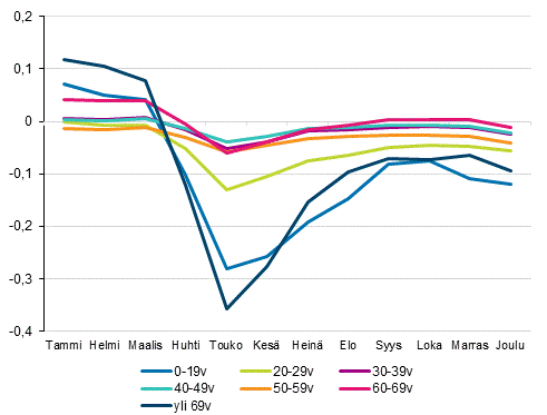Kuvio 3. Palkkatulonsaajien lukumäärän kuukausittainen vuosimuutos ikäryhmittäin vuonna 2020