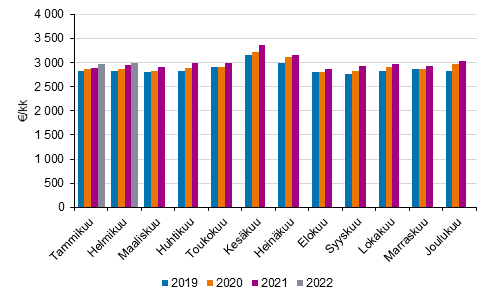 Palkkatulonsaajien palkkojen ja palkkioiden mediaani oli 3 014 euroa helmikuussa 2022, mikä oli 1,3 prosenttia enemmän kuin vuotta aiemmin. Samana aikana palkkatulonsaajien määrä nousi 1,8 prosenttia. Miesten mediaanitulo nousi 1,5 prosenttia 3 353 euroon ja naisten nousi 1,6 prosenttia 2 777 euroon helmikuussa 2022 vuoden takaiseen verrattuna. Samana aikana miespalkkatulonsaajien määrä kasvoi 1,6 prosenttia ja naispalkkatulonsaajien määrä nousi 1,9 prosenttia.