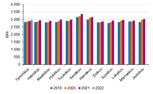 Kuvio 1. Palkka- ja palkkiotulojen mediaani kuukausittain 2019–2022