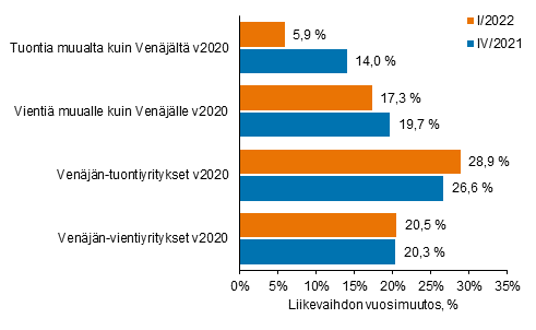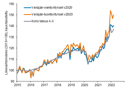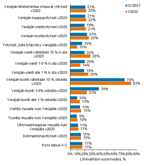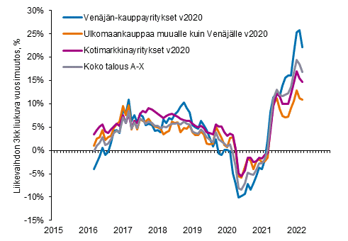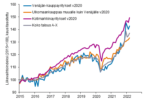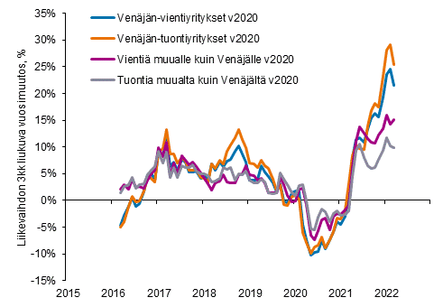 Venäjän-kauppaa harjoittaneiden yritysten liikevaihto on viime aikoina kasvanut muita ulkomaankauppayrityksiä nopeammin, ja lisäksi liikevaihdon kasvu kiihtyi vuoden 2022 ensimmäisellä neljänneksellä vuoden 2021 viimeiseen neljännekseen verrattuna. Venäjän-tuontia harjoittaneiden yritysten liikevaihto on kasvanut Venäjän-vientiyrityksiä nopeammin ja kiihtyi tammi-maaliskuun aikana selkeämmin. Etenkin ero Venäjän-tuontiyritysten ja muiden tavaratuontia harjoittaneiden yritysten kasvussa ja kehityksen suunnassa on merkittävä.