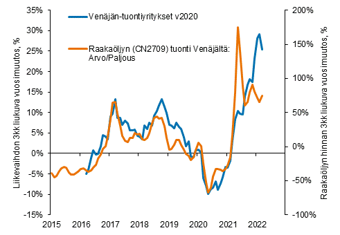 Syksystä 2021 alkaen etenkin Venäjän-tuontia harjoittaneiden yritysten liikevaihto on kasvanut nopeasti. Venäjän-kauppaa harjoittaneiden yritysten liikevaihto on kasvanut alkuvuonna 10–15 prosenttiyksikköä muita ulkomaankauppaa harjoittaneita yrityksiä nopeammin. Kovin kasvupiikki ajoittui joulukuulle 2021. Maaliskuussa 2022 kasvu hidastui 20 prosentin vauhtiin, mutta vielä kehityksessä ei näy käännettä.