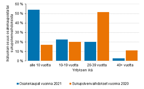 Iältään sukupolvenvaihdoksen kohteena olevat yritykset ovat usein vanhempia kuin osakekaupan kohteena olevat yritykset, kuten kuviosta 1 havaitaan. Vuonna 2020 yli puolet sukupolvenvaihdoksista, 277 kappaletta, toteutettiin iältään 20–39-vuotiaissa yrityksissä ja 60 kappaletta eli reilu kymmenes 40-vuotiaissa tai sitä vanhemmissa yrityksissä. Sukupolvenvaihdoksen kohteena olleista yrityksistä 108 kappaletta eli viidennes oli iältään 10–19-vuotiaita ja 91 kappaletta eli 17 prosenttia alle kymmenenvuotiaita. Sukupolvenvaihdosten ikäjakauma on ollut hyvin samankaltainen myös vuosina 2018 ja 2019.