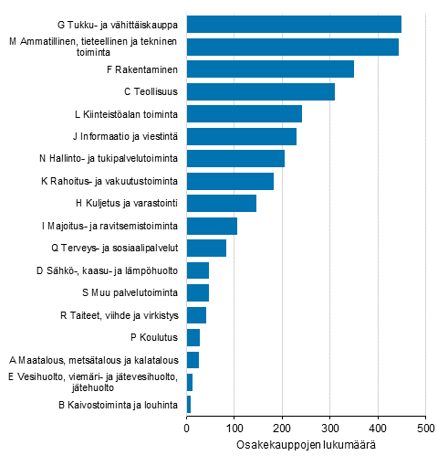 Kuviosta 2 nähdään, että toimialoittain tarkasteltuna lukumääräisesti eniten osakekauppoja toteutui kaupan toimialalla: yhteensä 449 kappaletta. Ammatillisen, tieteellisen ja teknisen toiminnan toimialalla toteutui 443 ja rakentamisessa 350 osakekauppaa. Toimialan kokoon suhteutettuna sähkö-, kaasu- ja lämpöhuolto -toimialalla on toteutunut osakekauppoja muita toimialoja enemmän suhteellisen osuuden ollessa 3,8 prosenttia.