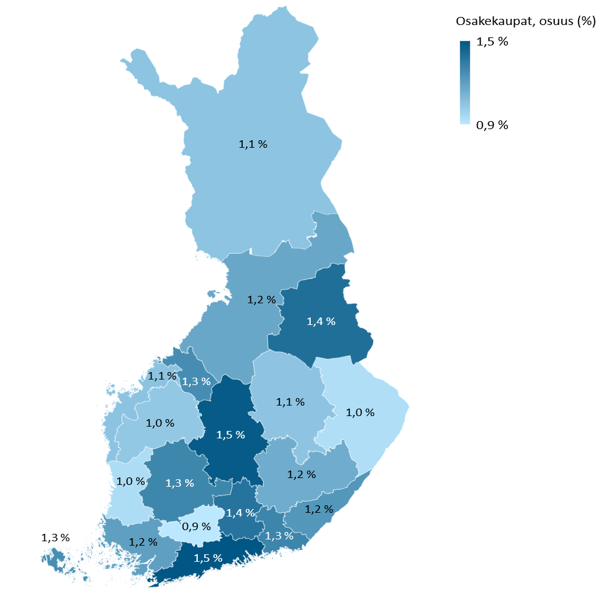 Osakekauppoja suhteellisesti eniten Uudellamaalla ja Keski-Suomessa