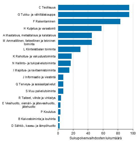 Toimialoittain tarkasteltuna sukupolvenvaihdoksia toteutettiin lukumääräisesti eniten teollisuuden, kaupan ja rakentamisen toimialoilla. Teollisuudessa ja kaupan alalla toteutettiin molemmissa 95 sukupolvenvaihdosta ja rakentamisessa 83 sukupolvenvaihdosta. Kun huomioidaan yritysten toimialoittaiset kokonaislukumäärät, on suhteellisesti eniten sukupolvenvaihdoksia toteutunut teollisuudessa, jossa sukupolvenvaihdosten osuus toimialan yritysten kokonaislukumäärästä on 0,34 prosenttia.