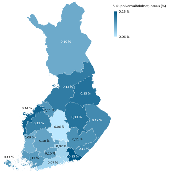 Maakunnittain tarkasteltuna sukupolvenvaihdoksista 115 kappaletta eli reilu viidennes toteutui Uudellamaalla. Varsinais-Suomessa toteutettiin 53 ja Pirkanmaalla 49 sukupolvenvaihdosta. Kuviossa 5 tarkastellaan sukupolvenvaihdosten alueellista jakaumaa yritysten maakunnittaiset kokonaislukumäärät huomioiden. Kuviosta havaitaan, että suhteellisesti eniten sukupolvenvaihdoksia on toteutunut Kymenlaaksossa, missä osuus maakunnan yritysten lukumäärästä on ollut 0,15 prosenttia. Suhteellisesti vähiten sukupolvenvaihdoksia on toteutunut Keski-Suomessa, missä osuus maakunnan yritysten lukumäärästä on ollut 0,06 prosenttia. Uudellamaalla on toteutunut maakunnan yritysten lukumäärään suhteutettuna toiseksi vähiten sukupolvenvaihdoksia.