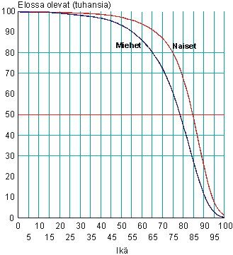 Nuoruusvuosien mentyä, elossa olevien määrissä alkaa tapahtua selvää vähenemistä, joka iän karttuessa kiihtyy miehillä jo 40. ikävuoden jälkeen, kun taas naisilla tuo aleneminen alkaa jonkin verran myöhemmin. Tämä ero tietysti johtuu miesten korkeammasta kuolevuudesta. Vuoden 2003 kuolevuuden tasolla vielä puolet miehistä on elossa 78-vuotiaana ja naisista 84-vuotiaana. Tuo kuvion elossa olevien y-akseli voidaan tulkita näin myös prosenttiluvuksi.